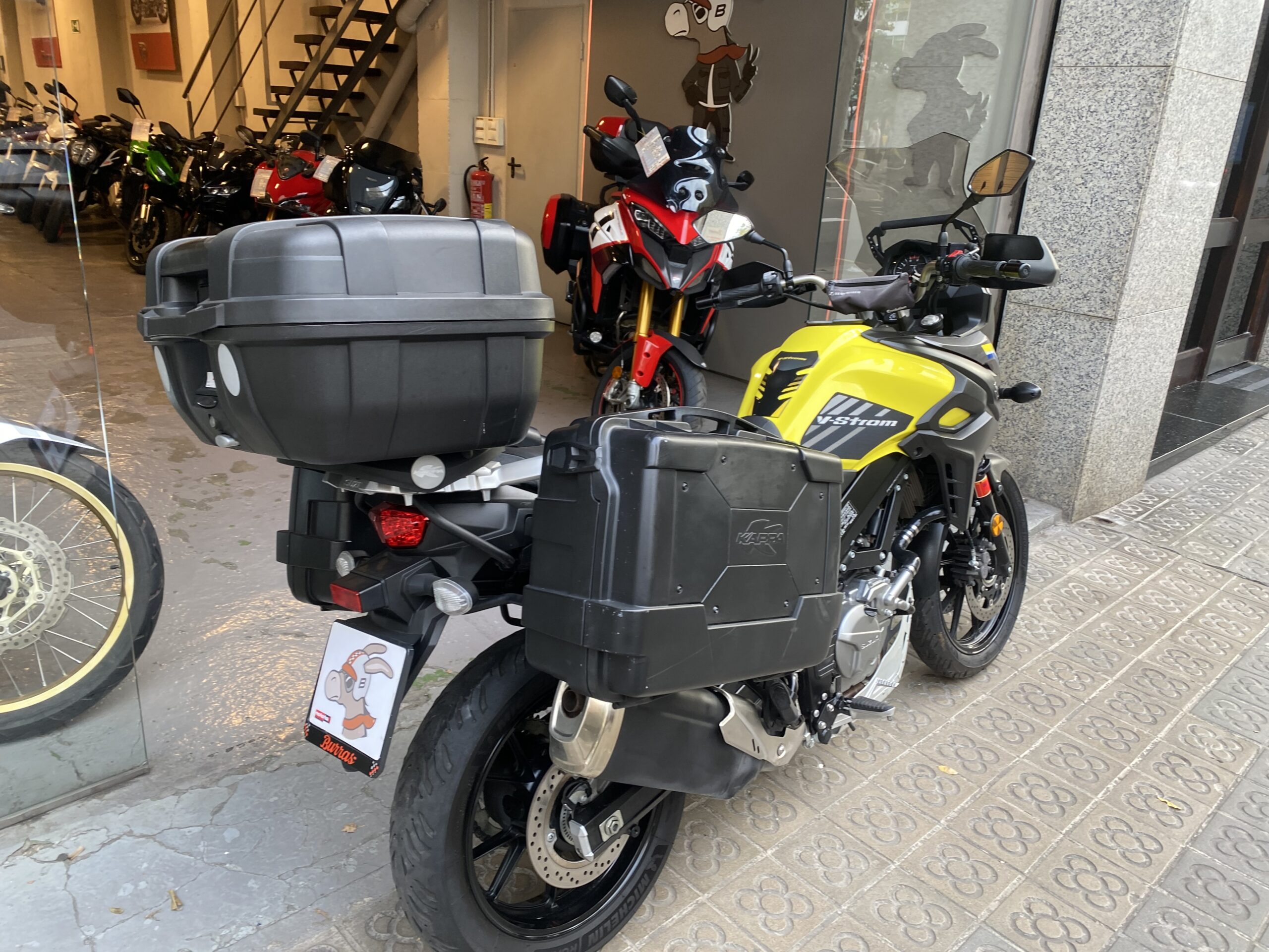 EQUIPA CABALLETE CENTRAL, CUBRECÁRTER, PROTECTOR DE DEPÓSITO, CÚPULA ALTA , BARRA SOPORTE DE NAVEGADOR/TELÉFONO Y TRES MALETAS GIVI.